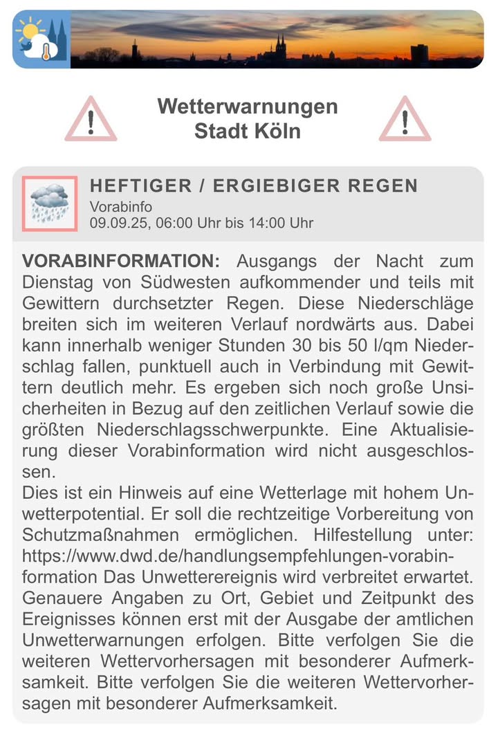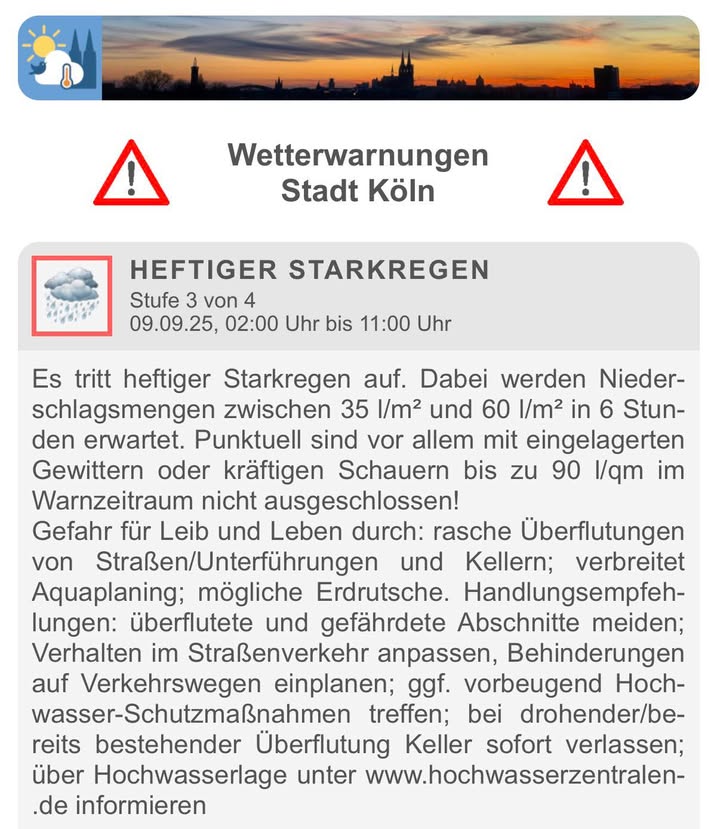 Der Deutsche Wetterdienst hat eine Vorabinformation vor heftigem / ergiebigem Regen für das Kölner Stadtgebiet ausgegeben (09.09.25, 06:00 Uhr bis 14:00 Uhr). Im genannten Zeitraum können demnach 30 bis 50 mm Regen fallen. Es bestehen allerdings noch große Unsicherheiten in Bezug auf den zeitlichen Verlauf und die Niederschlagsschwerpunkte. Ich habe einige Karten mit den akkumulierten Niederschlagsmengen bis morgen Abend von Kachelmannwetter angehängt. In den betroffenen Gebieten kann es zu Überschwemmungen kommen. Verfolgt die Warnlage! ![]() |