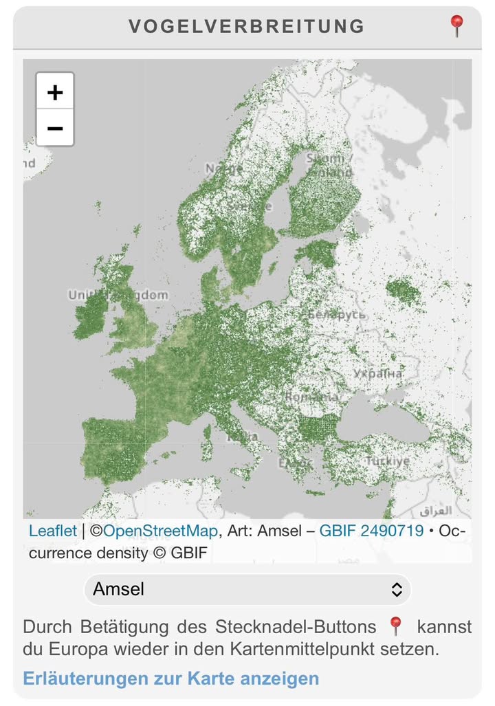 Auf der Vogelseite www.koeln-wetter.app/voegel findet ihr nun eine Vogelverbreitungskarte. Die Daten stammen vom GBIF-Portal und basieren auf tatsächlichen Meldungen. Über eine Auswahlliste oder über die Suchfunktion auf der Seite können die Verbreitungsgebiete der einzelnen Vogelarten angezeigt werden. Probiert es gleich mal aus! „Unser“ Amselmann hat die Mauser nun fast überstanden. Die Kopffedern werden immer zuletzt gewechselt. Er zeigt sich nun wieder häufiger. Die jungen Amseln sind weiterhin im Revier der Eltern. Andere Vogelarten wie Kohlmeisen oder Rotkehlchen singen sogar schon wieder. PS: Das Problem mit den nicht ankommenden Push-Mitteilungen unter iOS sollte behoben sein. Falls ihr ein iOS-Gerät habt und die aktuelle Version der Köln-Wetter-App installiert habt, freue ich mich über Rückmeldungen, ob eine Push-Nachricht zu diesem Beitrag angekommen ist. Einen schönen Sonntag 😊 ![]() |