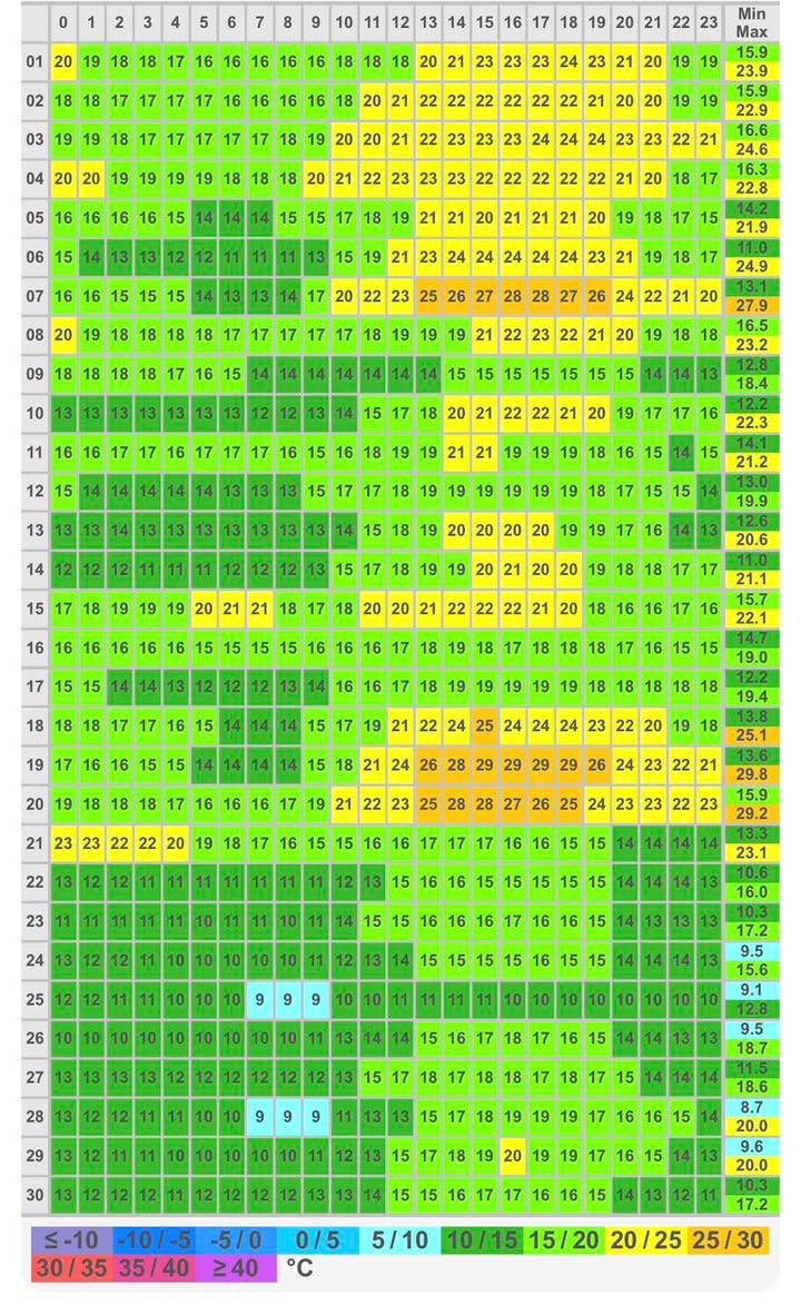 TEMPERATUR Min: 8,7 °C am 28. um 07:38 Uhr Max: 29,8 °C am 19. um 17:45 Uhr Durchschnitt: 16,6 °C Kältester Tag: Durchschnitt 10,2 °C am 25. Wärmster Tag: Durchschnitt 21,4 °C am 20. 4 Sommertage NIEDERSCHLAG Summe: 68,8 mm Max-Summe pro Tag: 32,3 mm am 09. Tage mit Niederschlag: 14 (+7 Radar) Regendauer: 28 Stunden WIND Max. Mittelwind: 22,7 km/h am 15. um 12:39 Uhr Windspitze: 72,4 km/h am 13. um 22:08 Uhr Hauptwindrichtung: SO LUFTDRUCK Min: 1003,6 hPa am 11. um 03:39 Uhr Max: 1026,7 hPa am 30. um 23:43 Uhr Durchschnitt: 1016,6 hPa SONNENSCHEIN 140 Sonnenstunden Köln-Wetter gibt es als App in den Stores oder unter www.koeln-wetter.app. Einen zusammenfassenden tabellarischen und grafischen Rückblick für den September 2025 an der Wetterstation Köln-Süd findet ihr ab sofort im „Archiv“, Rückblicke für jede einzelne Messgröße in der Menügruppe „Messwerte Köln-Süd“. In der Menügruppe „Messwerte Köln-Nord“ findet ihr Rückblicke für die einzelnen Messgrößen der Wetterstation Köln-Nord. Grafiken: 1. Temperatur (Stundendurchschnitt); 2. Niederschlag (Stundensummen); 3. Windböen (Stundenmaxima); 4. Sonnenscheindauer (Stundensummen) an der Wetterstation Köln-Süd. ![]() |