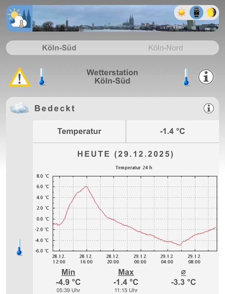 Heute früh wurde an der Wetterstation Köln-Süd mit -4,9 °C die niedrigste Temperatur dieses Jahres gemessen. www.koeln-wetter.app