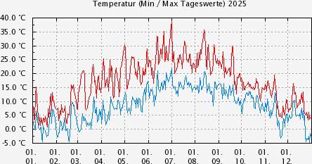 | TEMPERATUR Min: -4,9 °C am 29.12. um 05:45 Uhr Max: 38,4 °C am 02.07. um 14:19 Uhr Durchschnitt: 12,5 °C 0 Eistage 34 Frosttage 82 kalte Tage 57 Sommertage 16 Hitzetage 6 Tropennächte NIEDERSCHLAG Summe: 590,8 mm Max-Summe pro Tag: 32,3 mm am 09.09. Tage mit Niederschlag: 146 (+41 Radar) Trockenster Monat: März (9,0 mm) Nassester Monat: Juli (103,8 mm) Regendauer: 310 Stunden 5 Schneedeckentage WIND Max. Mittelwind: 33,8 km/h am 06.01. um 16:03 Uhr Windspitze: 72,4 km/h am 13.09. um 22:08 Uhr Hauptwindrichtung: OSO LUFTDRUCK Min: 981,3 hPa am 23.10. um 07:29 Uhr Max: 1043,9 hPa am 13.01. um 10:51 Uhr Durchschnitt: 1016,6 hPa SONNENSCHEIN 1913 Sonnenstunden Köln-Wetter gibt es als App in den Stores oder unter www.koeln-wetter.app. Einen zusammenfassenden tabellarischen und grafischen Rückblick für das Jahr 2025 an der Wetterstation Köln-Süd findet ihr ab sofort im „Archiv“, Rückblicke für jede einzelne Messgröße in der Menügruppe „Messwerte Köln-Süd“. In der Menügruppe „Messwerte Köln-Nord“ findet ihr Rückblicke für die einzelnen Messgrößen der Wetterstation Köln-Nord. Diagramme: 1. Temperatur (Min/Max Tag); 2. Niederschlag (Tagessummen); 3. Windböen (Tagesmaxima); 4. Sonnenscheindauer (Tagessummen) an der Wetterstation Köln-Süd.